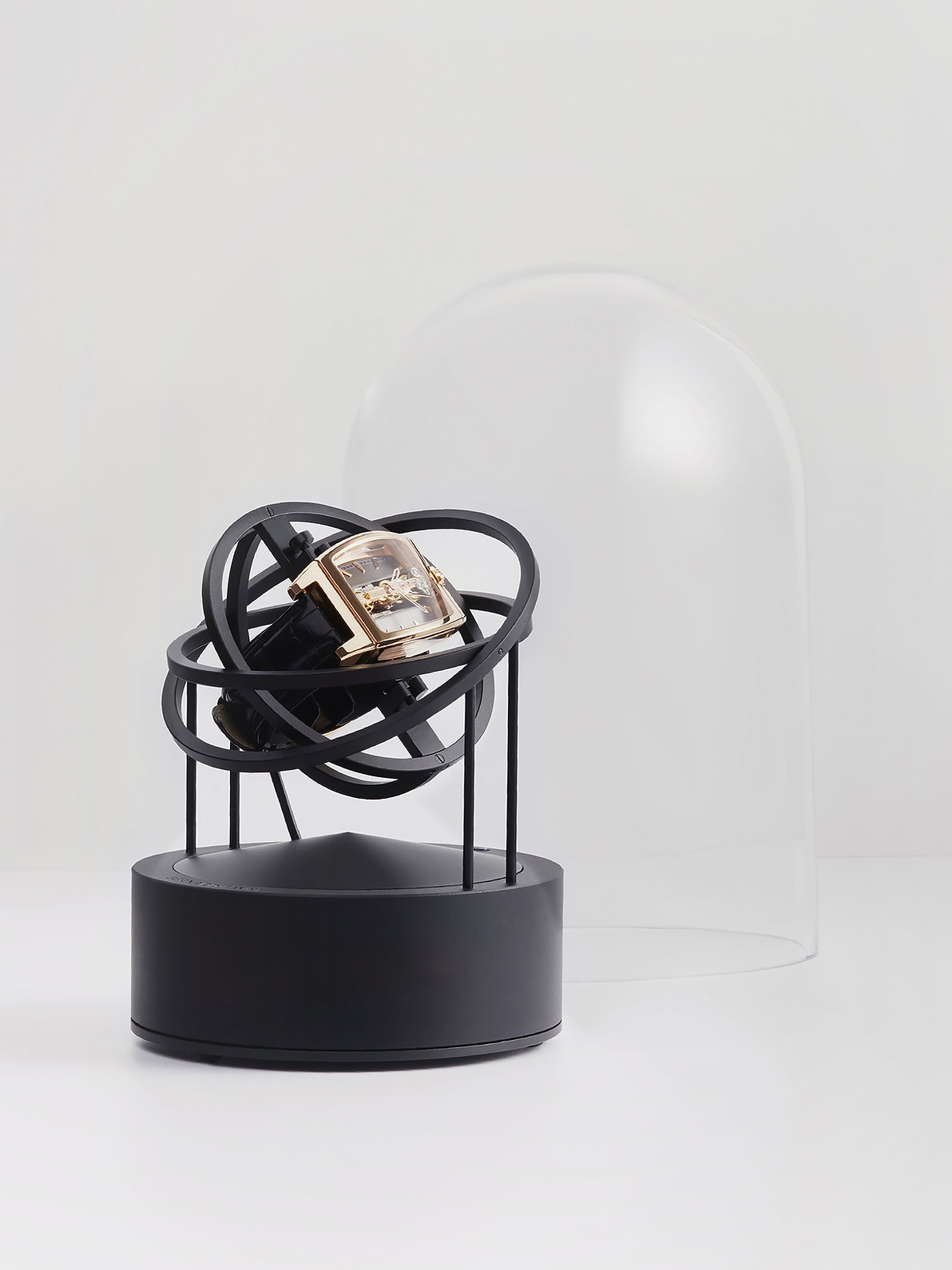 En elegant glasskuppel beskytter klokken mot både støv og nysgjerrige fingre, samtidig som den bidrar til å mystifisere den kinetiske balletten som foregår på innsiden. Winderen er her utført i sort, sandblåst aluminumsbase uten skinn med sorte, anodiserte ringer.
