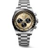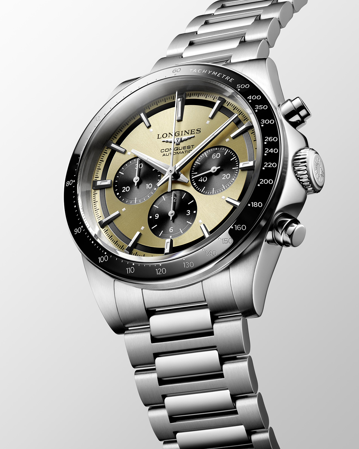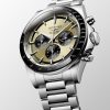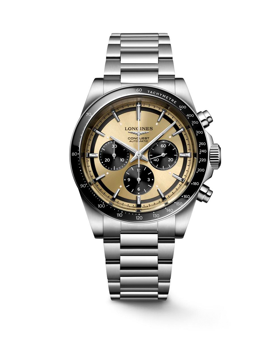 Siden 1954 har Conquest-kolleksjonen blitt produsert som en hyllest til de som våger å utforske nye horisonter utover det vanlige. Hver klokke inkorporerer en sømløs forening av ytelse og eleganse, som også inkluderer de mest avanserte tekniske egenskapene. Denne modellen i stål måler 42mm og har en gullfarget tallskive beskyttet av et ripesikkert safirglass. Klokken er drevet av Longines Calibre L898, et automatisk urverk med kronograf-funksjon og 59 timer gangreserve. Conquest Chronograph presenteres på en stållenke med trippel foldespenne.