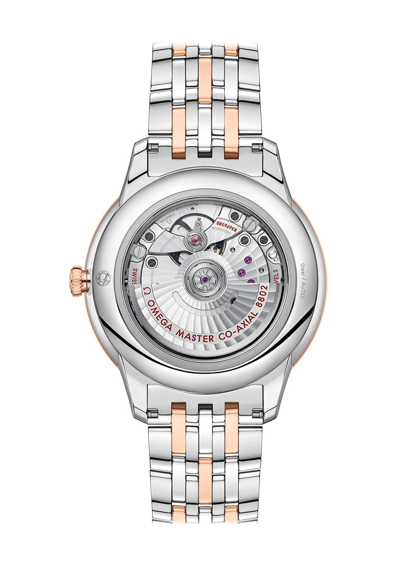 Denne klokken, sertifisert som en Master Chronometer, er lekkert presentert på et rustfritt stålbånd og drives av OMEGAs Master Co-Axial Calibre 8802, som kan beundres gjennom det ripebestandige safirglasset i baklokket.