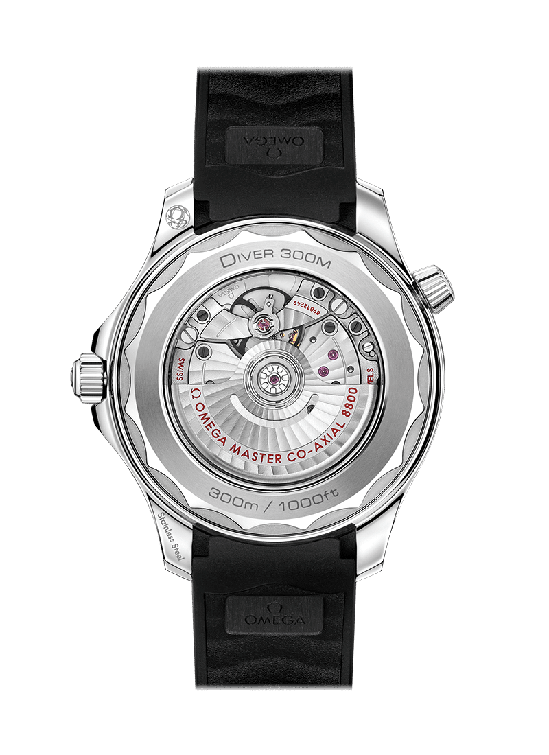 Klokken er presentert på en sort gummirem og drives av OMEGA Master Chronometer Caliber 8800, som kan sees gjennom safirglasset i baklokket.