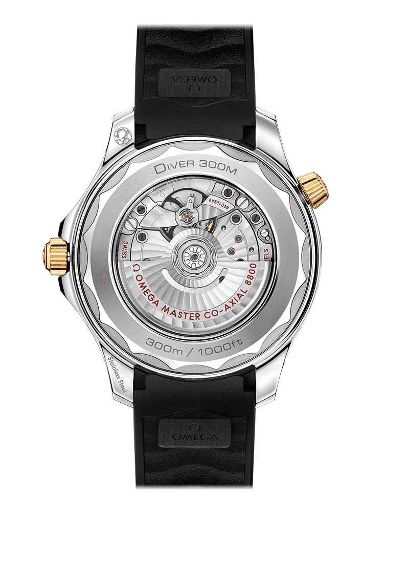 Klokken er presentert på sort gummirem og drives av OMEGA Master Chronometer Caliber 8800, som kan sees gjennom safirglasset i baklokket.