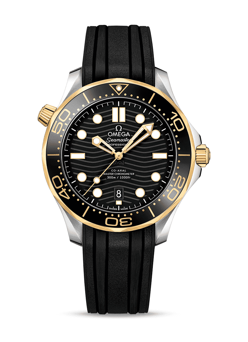 Siden 1993 har Seamaster Professional Diver 300M hatt en legendarisk tilhengerskare. Dagens kolleksjon har omfavnet den berømte tilknytningen til havet og oppdatert den med OMEGAs seneste design og innovasjoner. Denne 42 mm-modellen er laget av rustfritt stål og 18K gult gull, og inkluderer en sort keramisk bezel med en Ceragold™ dykkerskala. Urskiven er også produsert i polert sort keramikk og har lasergraverte bølger og et datovindu plassert ved klokken 6. De uthulede viserne og hevede indeksene er produsert i 18K gult gull og er fylt med hvit Super-LumiNova, mens heliumventilen har fått en konisk design.