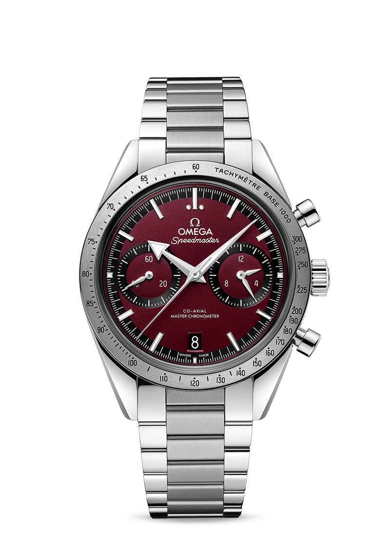 Den har en børstet bezel som inkluderer en svertet tachymeter-skala, og på baksiden av kassen er det en «Speedmaster ‘57»-gravering samt en flat safirkrystall med en antirefleksbehandling på innsiden.