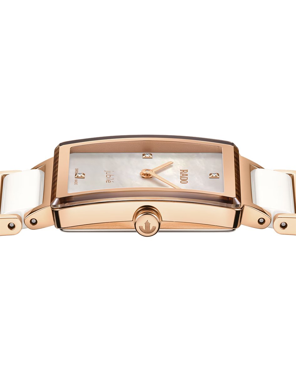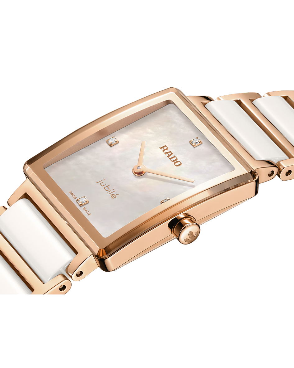 Rado Integral Diamonds er utsmykket med nøye utvalgte diamanter som fungerer som indeksmarkeringer på tallskiven. Diamantene tilfører diskret luksus og glans, samtidig som de understreker klokkens elegante uttrykk uten å gå på bekostning av Rados karakteristiske, rene design.