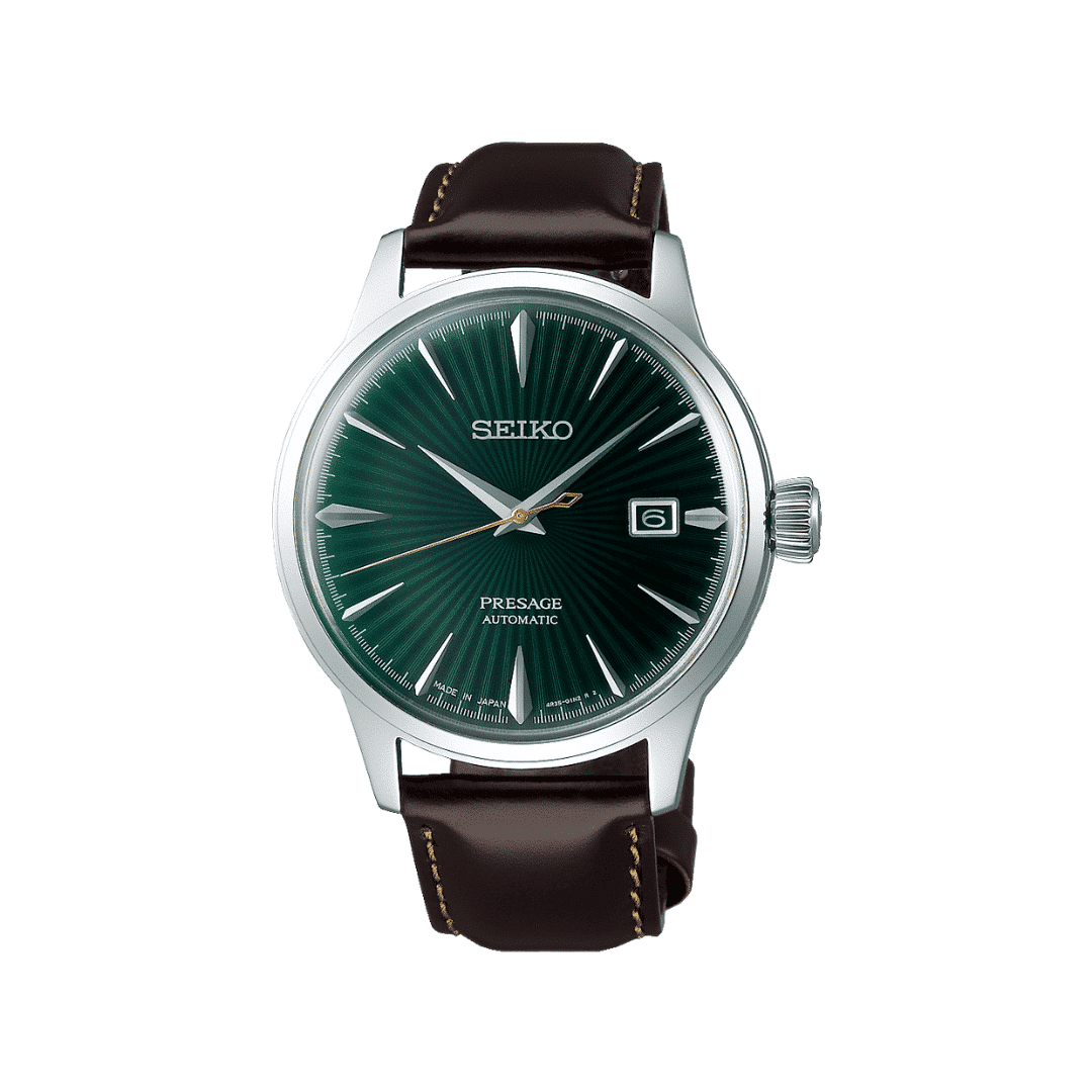 Slanke, skinnende indekser som illustrerer stemmen på et cocktailglass. Klassisk boksformet hardlex-krystall med delikate buede visere. Seiko Presage Cocktail Time henter inspirasjon fra drinker du finner i verdens barer, for å skape tallskiver med friskt fargespill. Denne modellen i stål måler 40.5 mm og har en grønn tallskive inspirert av cocktailen Mockingbird. SRPD37J1 er utstyrt med Seiko sitt egenutviklede kaliber 4R35, et automatisk urverk med datovisning og 41 timer gangreserve. Modellen er vanntett til 5 bar og presenteres på en brun skinnrem.