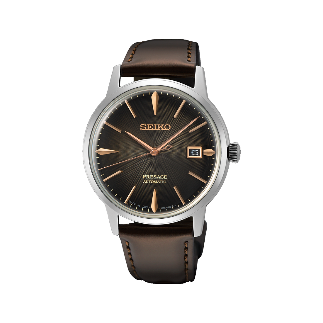 Slanke, skinnende indekser som illustrerer stemmen på et cocktailglass. Klassisk boksformet hardlex-krystall med delikate buede visere. Seiko Presage Cocktail Time henter inspirasjon fra drinker du finner i verdens barer, for å skape tallskiver med friskt fargespill. Denne modellen i stål måler 39.5 mm og har en brun tallskive inspirert av cocktailen Irish Coffee. SRPJ17J1 er utstyrt med Seiko sitt egenutviklede kaliber 4R35, et automatisk urverk med datovisning og 41 timer gangreserve. Modellen er vanntett til 5 bar og presenteres på en brun skinnrem.