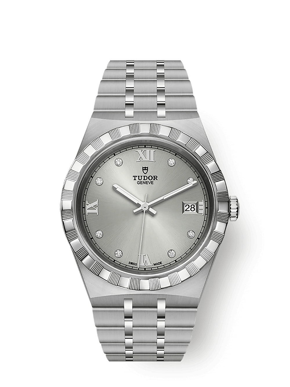 Tudor Royal M28500-0002 med sin integrerte lenke, 38mm kasse, giljose besel og automatiske urverk. Er Tudor Royal serien den optimale allsidige og rimelige sport-chic serien. I 38mm utgaven har klokken også dato-visning.