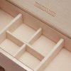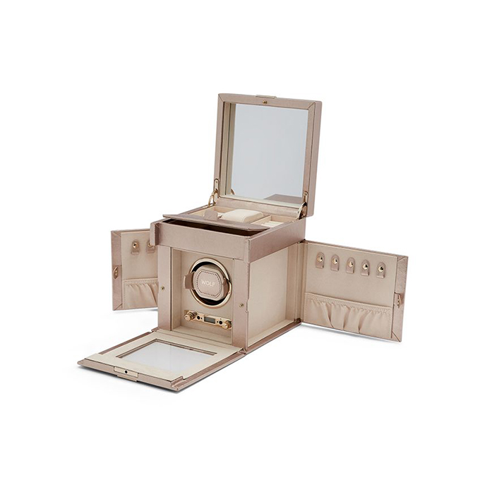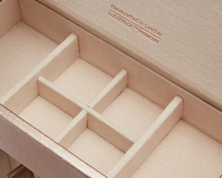 Oppbevaring: 1 winder, 1 stk klokkeoppbevaring, smykkeromfeatures 10 ring rolls and divided covered compartment. Side doors each hold 5 necklaces.